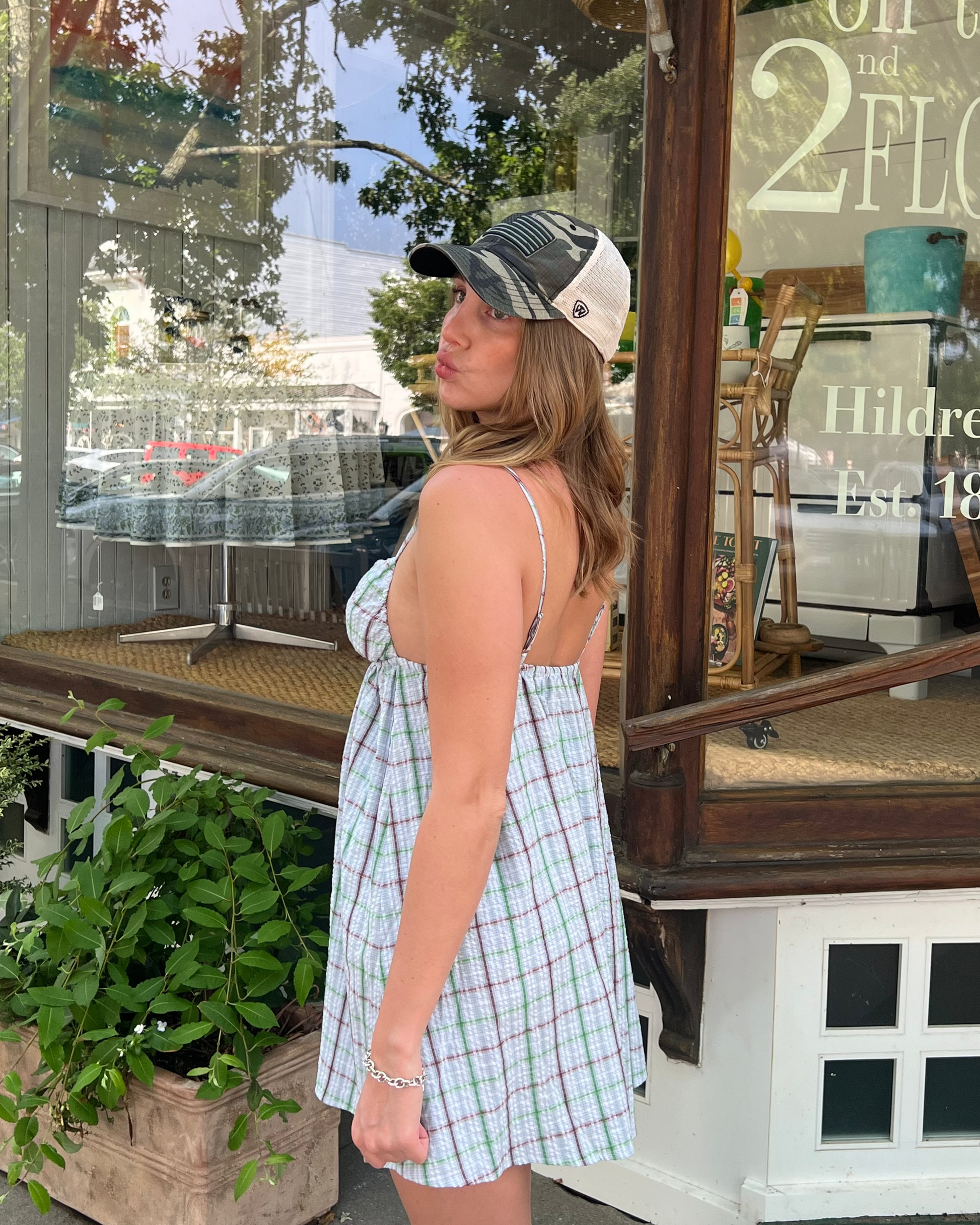 Our Giselle Dress in powder blue has a stunning dainty plaid pattern with hints of chocolate brown and forest green. It's baby doll fit makes it the perfect mini dress or size down and wear with jeans as the perfect summery top!
